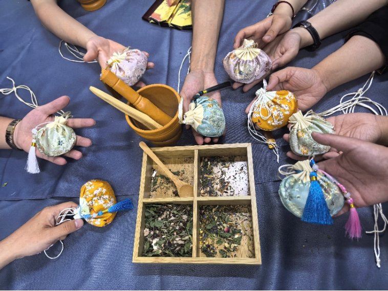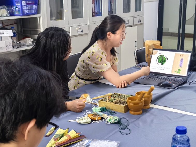 活动开始前,工作人员精心布置场地,分类摆放提神、助眠、香薰、驱蚊四类香料,并准备制作工具。现场播放中医药文化介绍,营造浓厚传统氛围。在知识讲解环节,同学们学习了各类香料的功效与文化内涵。制作过程中,大家根据需求挑选搭配:有人配提神香囊,有人制助眠配方,还有人做驱蚊香包。现场交流热烈,传统工艺与现代生活完美结合。活动尾声,同学们展示各自作品,分享制作心得。通过亲手实践,大家不仅掌握了香囊制作技艺,更深刻体会到中医药文化的独特魅力。