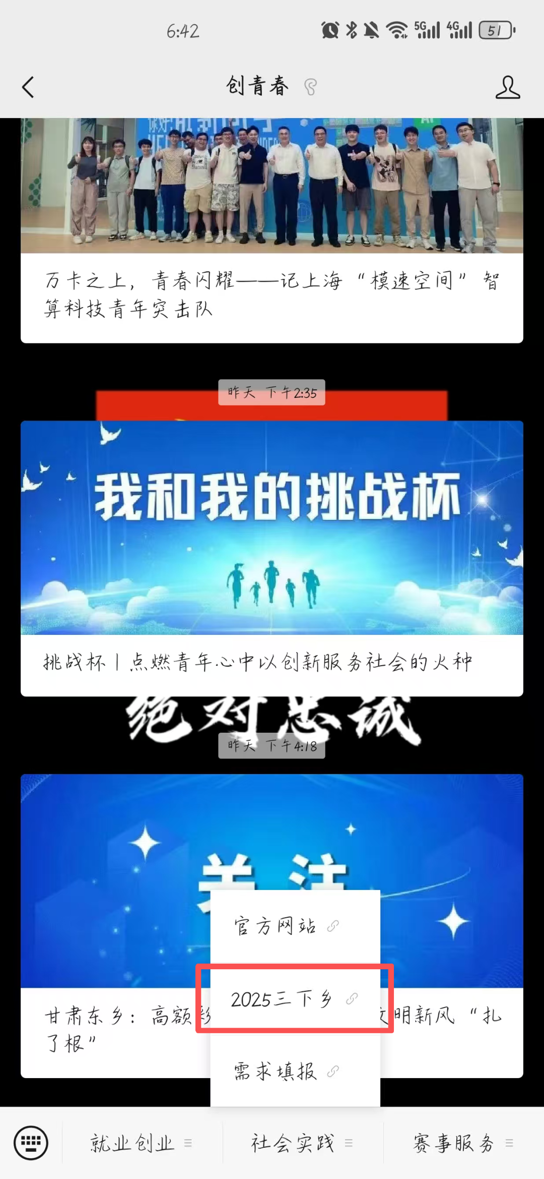 有意向的大学生结合自身实际情况,关注“创青春”微信公众号,选择“社会实践”-“2025三下乡”-“返家乡”栏目,进入小程序,并根据系统提示进行注册、登录、报名,报名截止时间2026年1月5日。(具体流程如下)
