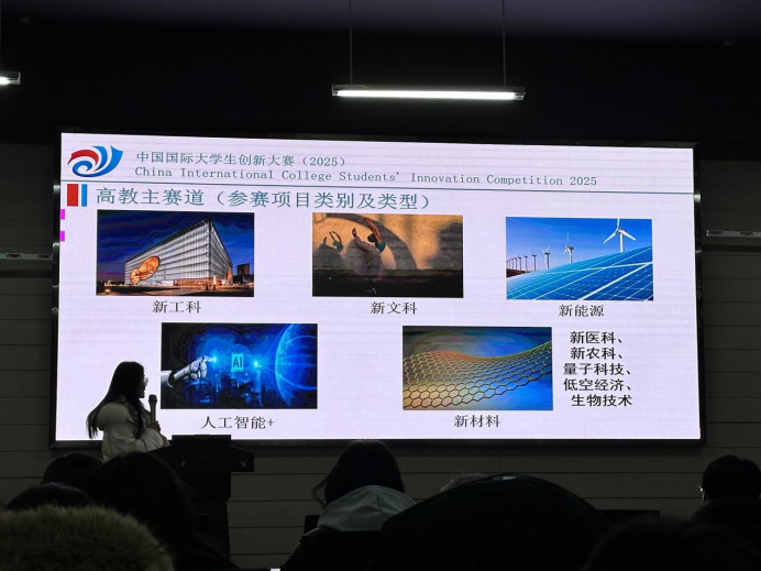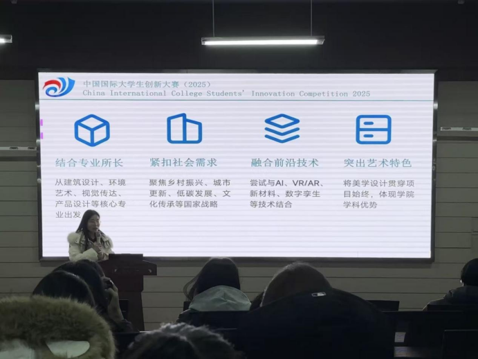 在分享会上,许欣老师以“筑梦创新·艺启未来”为主题,聚焦中国国际大学生创新大赛这一核心赛事,从赛事特色、参赛要求、备战策略等关键维度展开深度解析。许老师首先介绍了大赛高教主赛道、青年红色筑梦之旅赛道、产业命题赛道三大主体赛道的差异化定位——高教主赛道侧重“新工科、新医科、新农科、新文科”四新领域创新,青年红色筑梦之旅赛道聚焦乡村振兴与社会服务,产业命题赛道则通过校企协同解决企业实际难题。