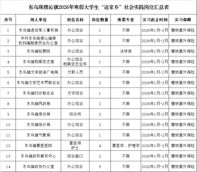 扬帆计划@东乌大学生!东乌珠穆沁旗2026年寒假大学生“返家乡”社会实践开始报名啦